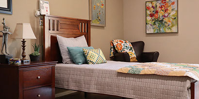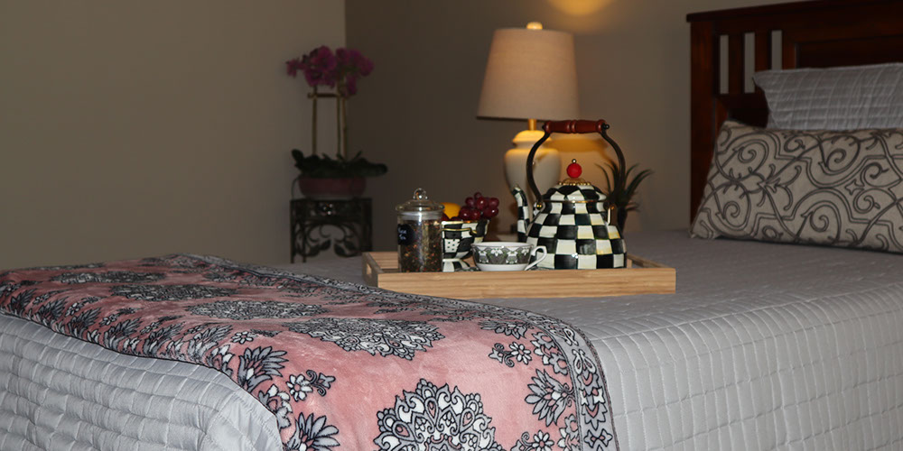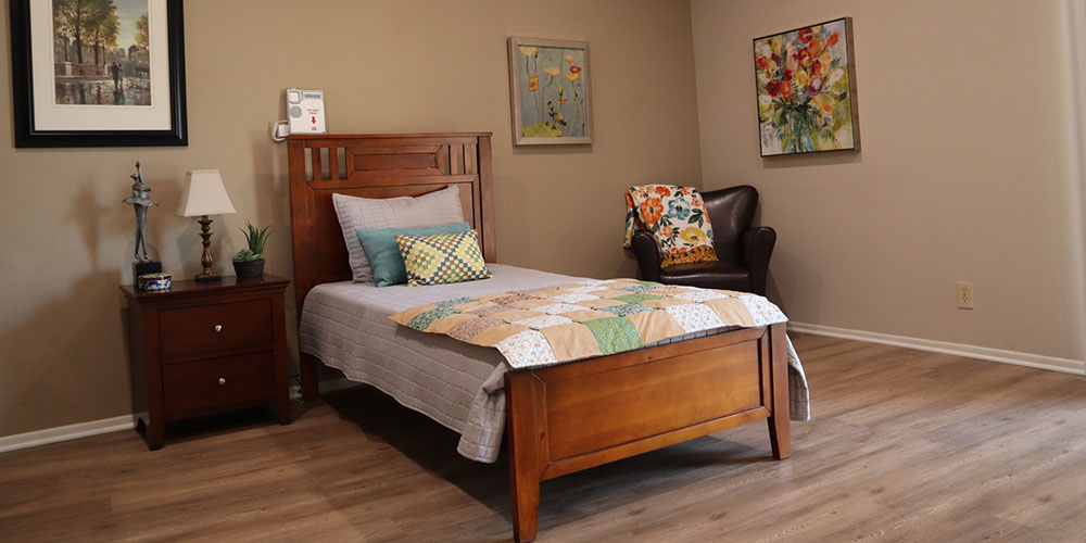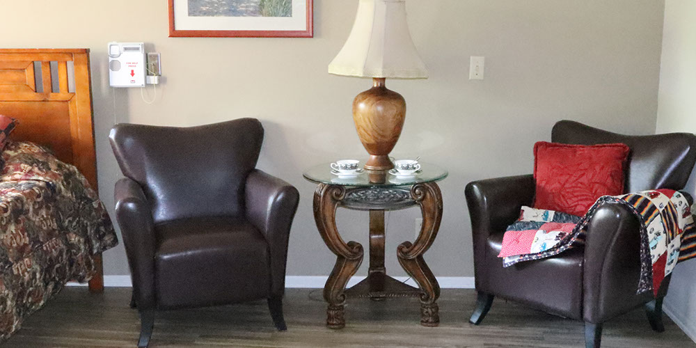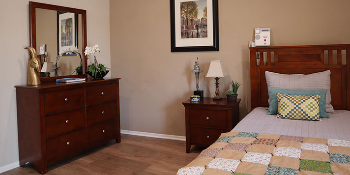 Beautiful sunlit private resident apartments. Call buttons and pull cords located next to beds.