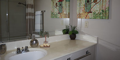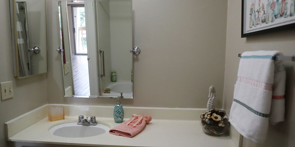 Large bathroom counter tops and mirrors are featured in every apartment.